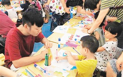 图为台湾实习生在北京首都图书馆少儿阅览室教小朋友做手工。