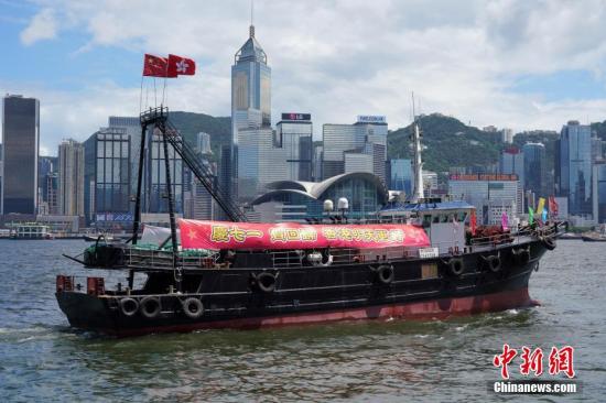 下午1时许,在香港维多利亚港,渔船上的五星红旗和香港区旗猎猎飘扬,香港渔民联会举行的渔船巡游正式拉开序幕。