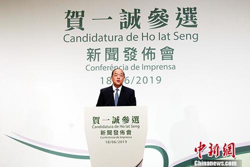 资料图为,6月18日,澳门特区立法会主席贺一诚举行新闻发布会,宣布正式参选澳门特区第五任行政长官。澳门特区行政长官选举日将于今年8月25日举行,目前已有4人宣布参选。中新社发 钟欣 摄