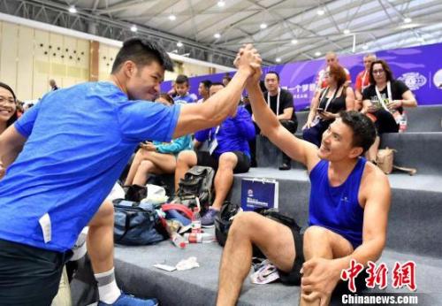 刚结束一场激烈的室内划艇2000米重量级比赛,香港警察刘松源靠在简易的观众台上休息,大汗淋漓的他不住喘气。刘松源的队友见状,从观众台另一侧走来和他击掌加油打气,两人用不标准的四川话同时大喊“雄起”(四川话加油的意思)。