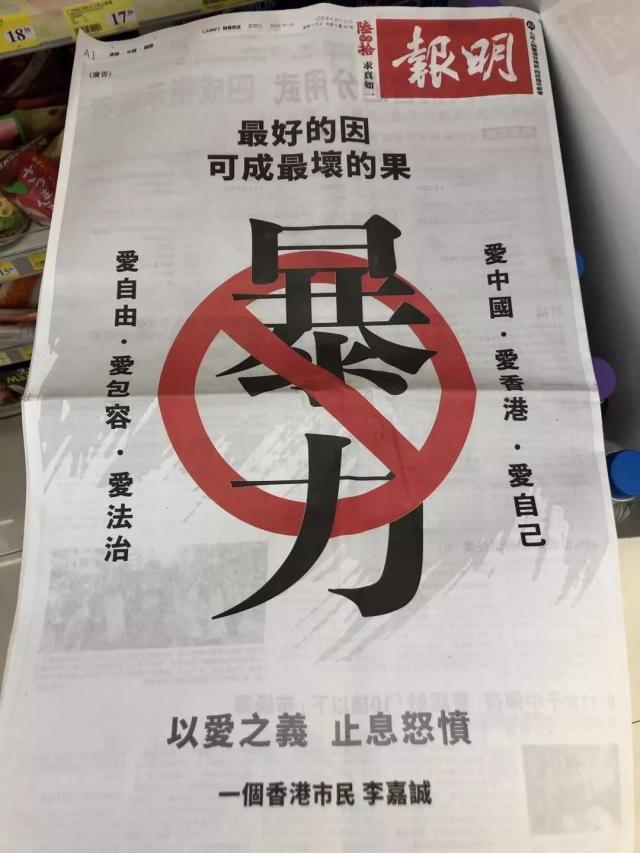 《香港商报》头版刊登的广告正中间是一个红色的禁止标识盖在“暴力”二字之上,左右两边分别写着“爱中国 爱香港 爱自己”与“爱自由 爱包容 爱法治”,下方则写有“以爱之义 止息怒愤”,署名是“一个香港市民 李嘉诚”。同样的广告16日也刊登在《明报》《成报》等报纸上。