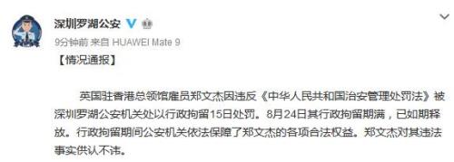 中新网8月24日电 据深圳市公安局罗湖分局官方微博消息,英国驻香港总领馆雇员郑文杰因违反《中华人民共和国治安管理处罚法》被深圳罗湖公安机关处以行政拘留15日处罚。8月24日其行政拘留期满,已如期释放。行政拘留期间公安机关依法保障了郑文杰的各项合法权益。郑文杰对其违法事实供认不讳。