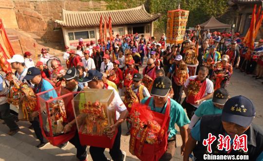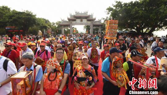 中新网福建湄洲岛9月16日电 (周建国)16日下午,台湾寰宇妈祖文化国际交流协会会长、北港朝天宫董事长蔡咏锝率23家台湾宫庙450余名妈祖信众登上“妈祖故里”福建莆田湄洲岛,赴妈祖祖庙谒祖进香。
