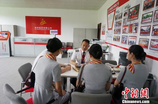 桂林航空台籍机长邱麦纶和同事做飞行前的各项准备。 欧慧兰 摄