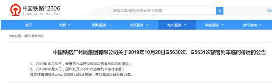 中国铁路广州局集团有限公司关于2019年10月20日G5630次、G5631次旅客列车临时停运的公告