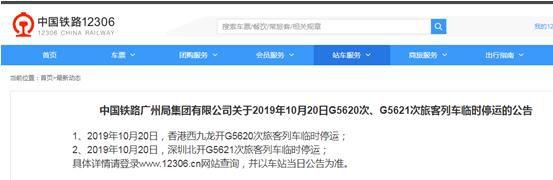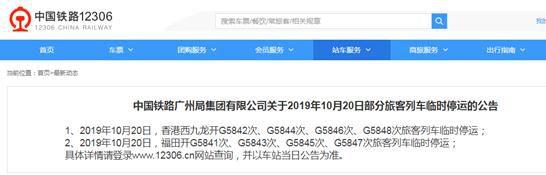 1、2019年10月20日,香港西九龙开G5842次、G5844次、G5846次、G5848次旅客列车临时停运;