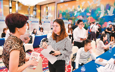 在厦门大学就读的台湾学生(前左二)在台湾专业人才就业创业对接会上与招聘人员交流。