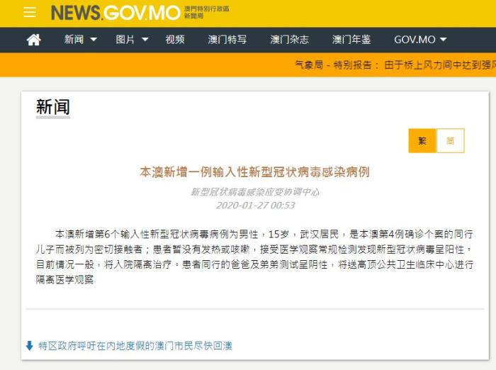 中新网1月27日电 据澳门特区政府新闻局网站消息,澳门新增1例新型冠状病毒确诊病例,目前已有6人感染新型冠状病毒。