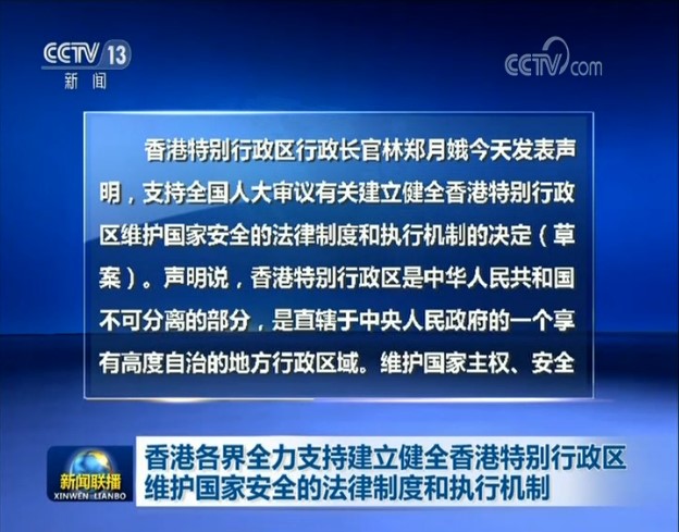 央视网消息(新闻联播):香港各界人士表示,维护国家安全是“一国两制”的核心要义,从国家层面建立健全香港特别行政区维护国家安全的法律制度和执行机制,非常有必要,不仅是香港对国家的宪制责任,也是维护自身利益的迫切需要。