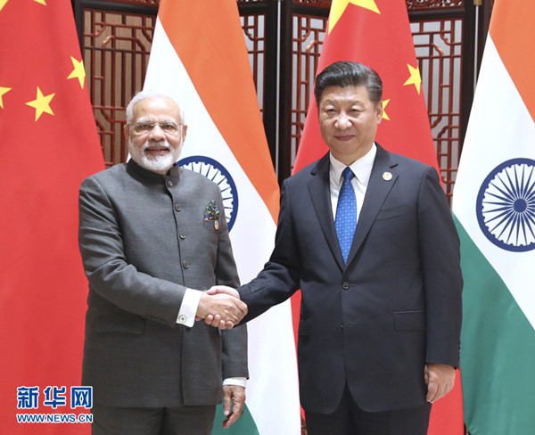 2017年9月5日,国家主席习近平在厦门会见来华出席金砖国家领导人第九次会晤和新兴市场国家与发展中国家对话会的印度总理莫迪。 新华社记者 马占成摄(资料图)