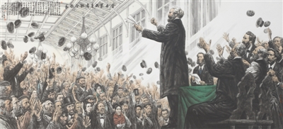其中,由冯远创作的中国画《在国际工人协会(第一国际)成立大会上》,选取马克思于1864年9月在国际工人协会成立期间,受委托起草“成立宣言”和“临时章程”等重要文件,并向领导机构和来自法国、德国、意大利、波兰、爱尔兰的工人代表介绍文件内容的历史情节,以情景再现的方式,表现该史实的瞬间。创作者采用现场参与者的身份,从讲台左侧以低视角构图表现演讲中的马克思——他正说出工人阶级的心声,并号召全世界无产者联合起来,为争取和捍卫自身的权益而斗争。为表现现场热烈的气氛,作者有意突出台上工人协会执委和台下工人代表群情激昂、热烈鼓掌的互动氛围,并且以严谨的造型和写实手法,深入刻画众多人物的生动形象,从而通过思想家和无产者的关系,揭示这一创作主题的内容和历史意义。