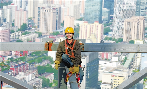 北京“中国尊”建筑工地上,中建三局北京公司CBD大项目部农民工陈健康在施工现场。 新华社记者 金良快摄