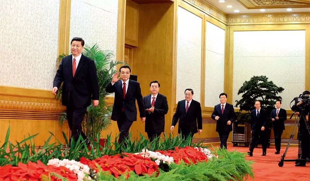 ▲ 2012年11月15日,刚刚在中国共产党第十八届中央委员会第一次全体会议上当选的中共中央总书记习近平和中央政治局常委李克强、张德江、俞正声、刘云山、王岐山、张高丽在北京人民大会堂同采访十八大的中外记者亲切见面 丁林摄