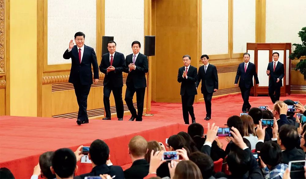 ▲ 2017年10月25日,刚刚在中国共产党第十九届中央委员会第一次全体会议上当选的中共中央总书记习近平和中共中央政治局常委李克强、栗战书、汪洋、王沪宁、赵乐际、韩正在人民大会堂同采访十九大的中外记者亲切见面 马占成摄