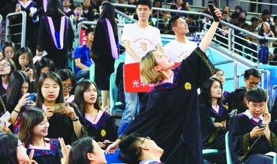 在北京大学2017年本科生毕业典礼暨学位授予仪式开始前,一名毕业生与同学自拍。新华社记者 沈伯韩摄