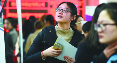 3月10日,江苏省2018年女大学毕业生专场招聘会在南京举行。图为一位女大学生在招聘会上寻找就业岗位。新华社记者 孙参摄