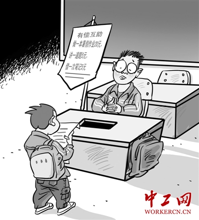 “做一本暑假作业20元,讲一道题5元,借一次笔记5元,如果没钱,用笔记本、签字笔、橡皮、薯片等东西来换也行”——据《北京晚报》报道,时下,一些中小学校园出现同学间的“有偿帮助”,明码标价。不少家长对此表示担忧。