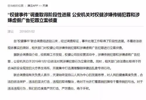 据中国之声《新闻纵横》报道:昨天,“权健事件”联合调查组通报了阶段性进展:经过前期工作,调查组发现权健公司在经营活动中涉嫌传销犯罪和涉嫌虚假广告犯罪,公安机关于2019年1月1日依法对其涉嫌犯罪行为立案侦查。“涉嫌犯罪”,这是官方对权健事件给出的最新定性。