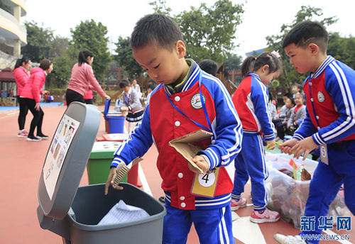 资料图:在重庆市北碚区缙云幼儿园,孩子们参加垃圾分类比赛。(图据新华网)
