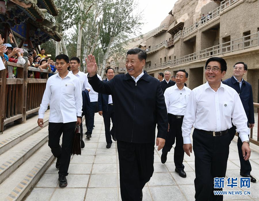8月19日至22日,中共中央总书记、国家主席、中央军委主席习近平在甘肃考察。这是19日下午,习近平在敦煌莫高窟考察调研时,向正在参观的游客亲切招手致意。新华社记者 谢环驰 摄