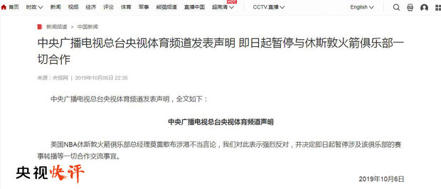 近日,美国NBA休斯敦火箭队总经理莫雷在其社交媒体账号上宣扬香港极端暴力分子的口号,在中国遭到集中批评。中国驻休斯敦总领馆已经向火箭队提出严正交涉。中国篮协、中央广播电视总台央视体育频道相继宣布暂停与该俱乐部的交流合作、转播等事宜。除此之外,休斯敦火箭队在中国的多家赞助商纷纷发表官方声明,宣布暂停或终止与火箭队的相关合作。