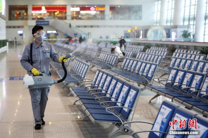 1月27日,工作人员在火车站候车大厅内开展消毒工作。中新社记者 泱波 摄