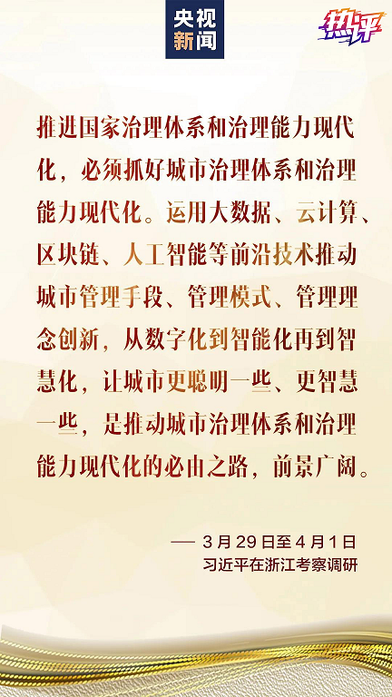 习近平在考察期间来到杭州城市大脑运营指挥中心,观看了“数字治堵”、“数字治城”、“数字治疫”等应用展示。他指出,运用大数据、云计算、区块链、人工智能等前沿技术推动城市管理手段、管理模式、管理理念创新,从数字化到智能化再到智慧化,让城市更聪明一些、更智慧一些,是推动城市治理体系和治理能力现代化的必由之路,前景广阔。
