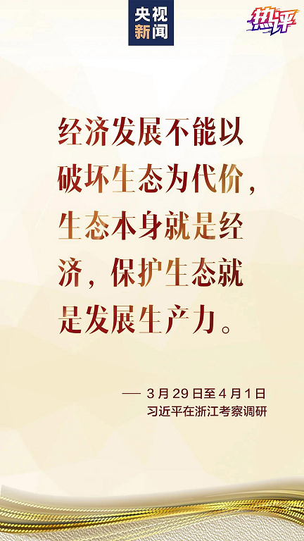 习近平强调,实践证明,经济发展不能以破坏生态为代价,生态本身就是经济,保护生态就是发展生产力。希望乡亲们坚定走可持续发展之路,在保护好生态前提下,积极发展多种经营,把生态效益更好转化为经济效益、社会效益。