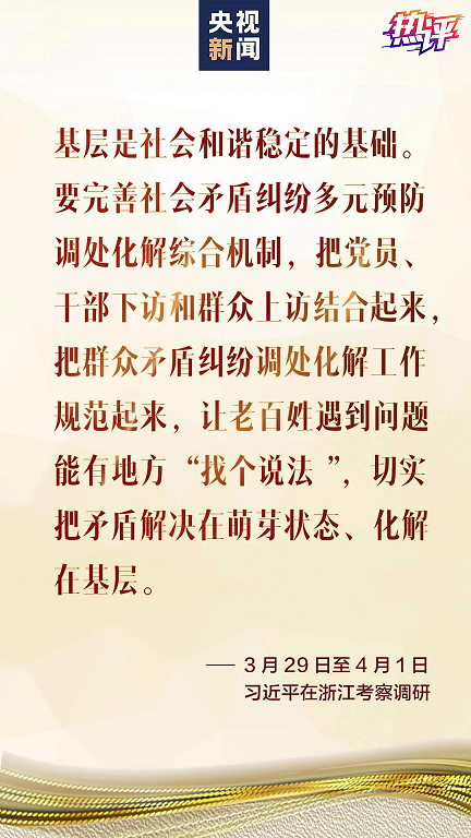 3月30日,习近平来到安吉县社会矛盾纠纷调处化解中心,了解群众矛盾纠纷一站式接收、一揽子调处、全链条解决模式运行情况。习近平强调,基层是社会和谐稳定的基础。要完善社会矛盾纠纷多元预防调处化解综合机制,把党员、干部下访和群众上访结合起来,把群众矛盾纠纷调处化解工作规范起来,让老百姓遇到问题能有地方“找个说法”,切实把矛盾解决在萌芽状态、化解在基层。