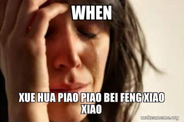 外国网友认为,这句歌词让人听出了“孤寂绝望的感觉”,再加上那种让他们“生不如死”的中文发音,他们渐渐把它变成了一个梗,以表示自己面临的情况很窘迫、很惨。于是,“XUE HUA PIAO PIAO BEI FENG XIAO XIAO”便成了百搭的后缀——月底没钱了,和女朋友分手了,后面都可以加上一句“XUE HUA PIAO PIAO BEI FENG XIAO XIAO”。