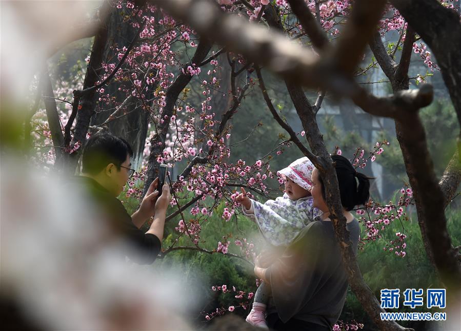 4月1日,一名小朋友在家长陪同下在北京明城墙遗址公园踏青赏花。 新华社记者 罗晓光 摄