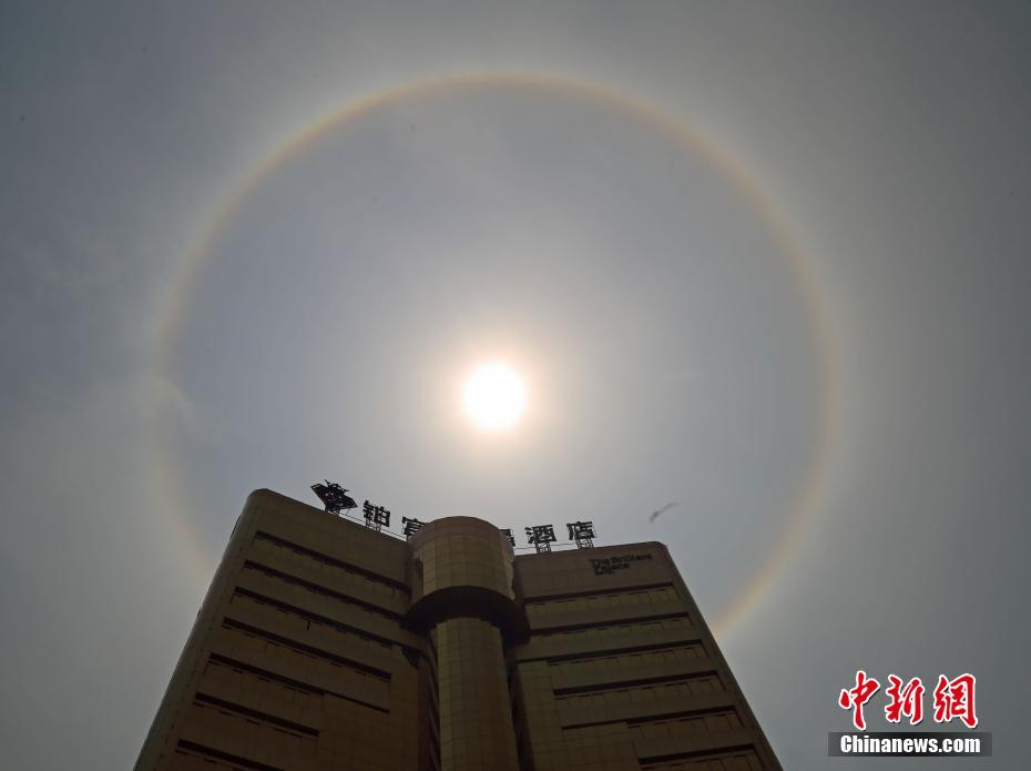 4月3日,广西南宁市横县上空出现一道天象奇观——日晕,巨大的光环像给太阳戴上了一枚戒指,也如一枚闪闪发光的铜钱,吸引众多民众围观拍照。据介绍,日晕又叫圆虹,是日光通过卷层云时,受到冰晶的折射或反射而形成的。日晕多出现在春夏季节,民间有“日晕三更雨,月晕午时风”的谚语,在一定程度上可作为天气变化的前兆。 林浩 摄