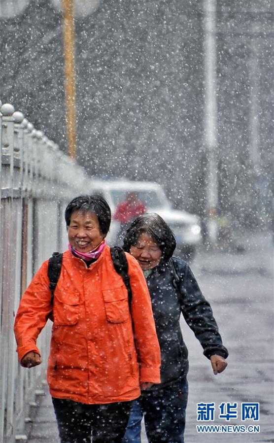 4月3日,市民行走在延庆区雪中的街道上。当日,华北中部地区气温骤降,位于燕山山脉脚下的北京市延庆区降下一场春雪。 新华社记者 李欣 摄