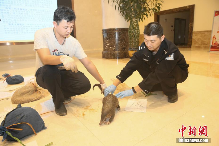4月4日,南宁海关通报,其隶属东兴海关缉私分局近日在东兴查获一起涉嫌走私穿山甲案件,现场查获活体穿山甲14只,查扣非法改装的摩托车1辆,抓获涉案人员1名。穿山甲被列为中国二级保护动物,走私穿山甲及其制品可判处5年以上有期徒刑,并处罚金。 中新社记者 林浩 摄