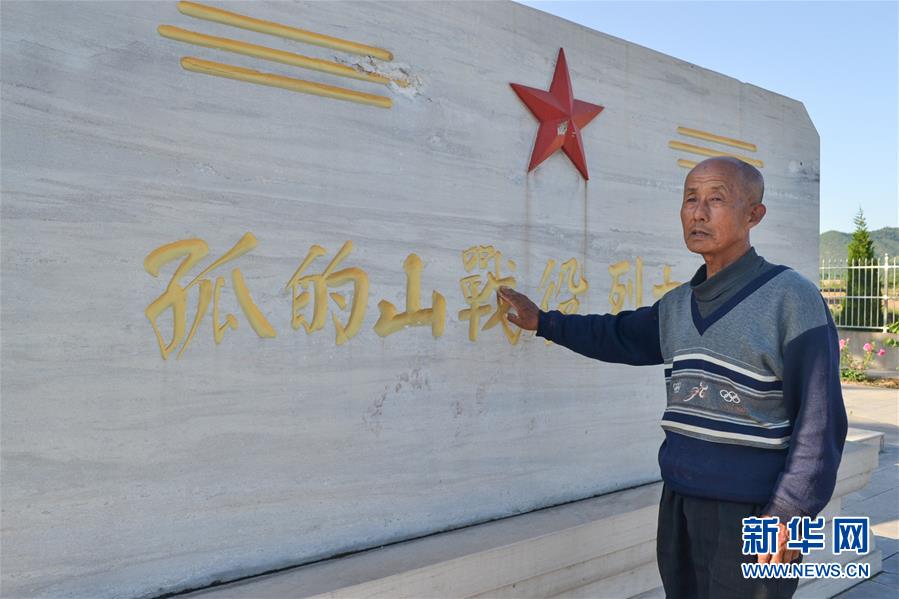 郭王所老人介绍阳邑烈士陵园孤的山战役烈士公墓的修建始末(2017年5月17日摄)。连日来,河北武安市大山深处的郭王所老人每天都要到阳邑烈士陵园清扫公墓,接待祭扫的群众。他与父亲郭成忠接力为133位烈士英魂守墓的事迹在当地广为传颂。新华社发