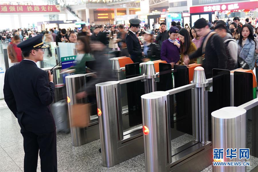 4月5日,旅客在上海虹桥火车站检票进站。当日,记者从中国铁路上海局集团有限公司获悉,该集团公司京沪、沪宁、沪杭、杭甬、宁安、合福等高铁沿线的火车站迎来清明节旅客出行高峰,预计发送旅客约275万人次。该集团公司采取加开客车、动车组重联等方式,当天加开上海至苏州、无锡、南京等方向客车114列。新华社记者 陈飞 摄
