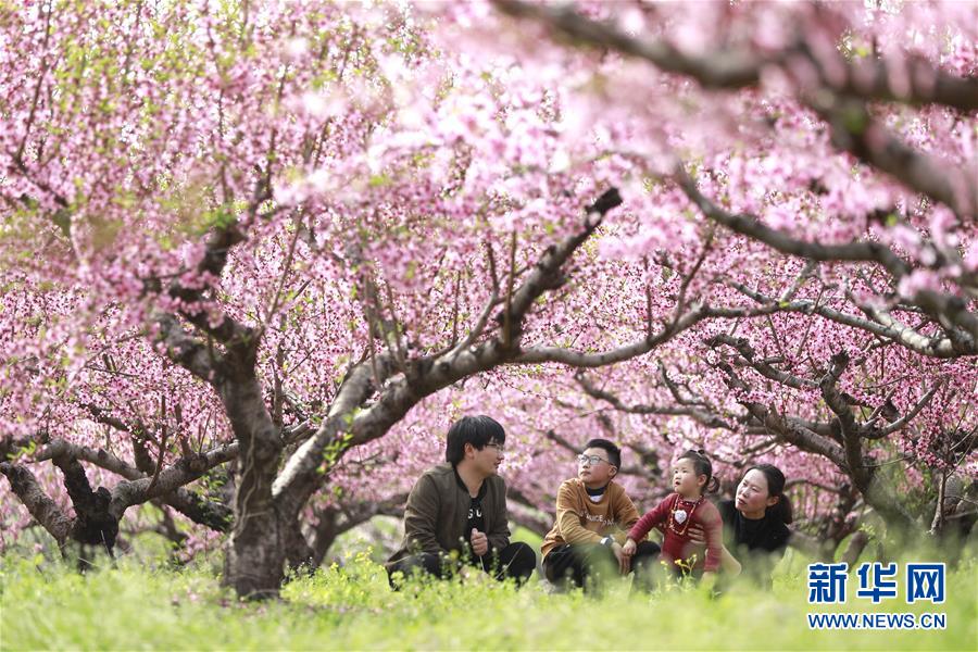 4月5日,游人在江苏省淮安市盱眙县玉皇山现代农业园踏青游玩。清明小长假期间,人们纷纷走到户外,踏青赏花,亲近自然。 新华社发(周海军 摄)