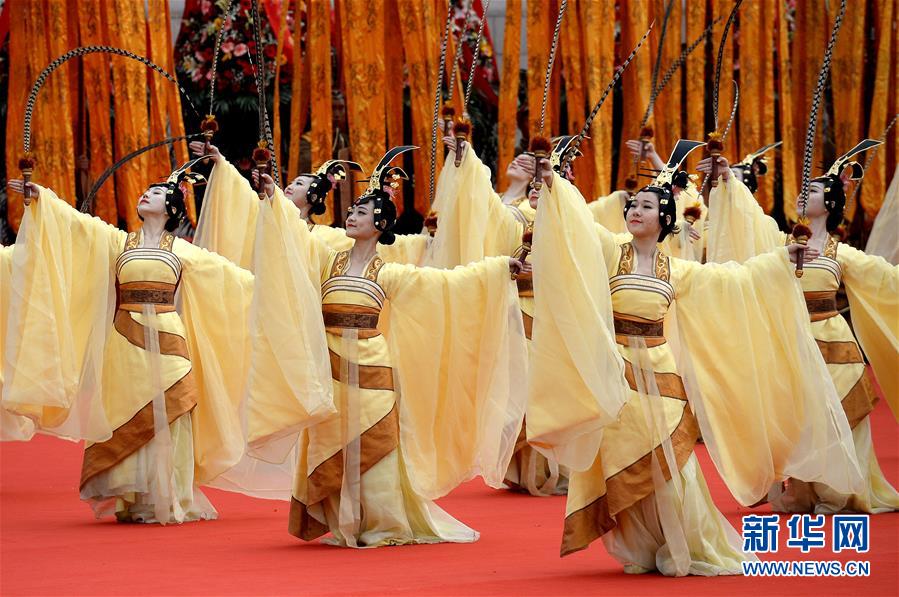 4月5日,演员在公祭轩辕黄帝典礼上表演黄帝祭典乐舞告祭。当日,戊戌年清明公祭轩辕黄帝典礼在陕西省黄陵县桥山黄帝陵祭祀广场举行,近万名海内外中华儿女参加仪式。 新华社记者 刘潇 摄