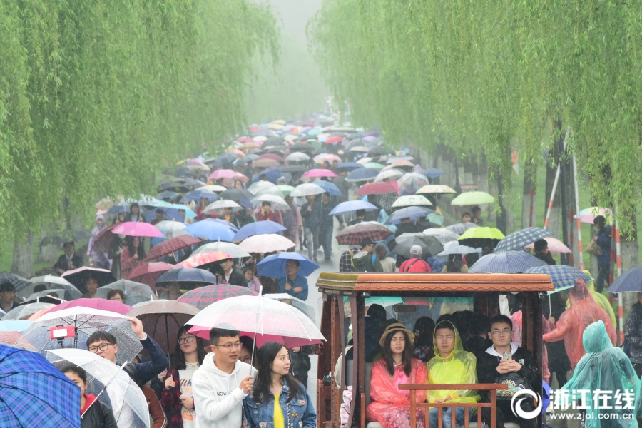 4月5日,清明小长假首日,杭州细雨绵绵,西湖景区游客络绎不绝。杭城虽降雨降温,但西湖景区前来赏花踏青的游客如潮,断桥似人桥。(浙江在线拍友 里尔 柱子 摄)