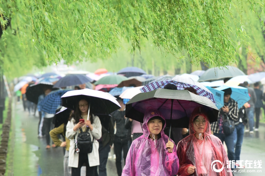 4月5日,清明小长假首日,杭州细雨绵绵,西湖景区游客络绎不绝。杭城虽降雨降温,但西湖景区前来赏花踏青的游客如潮,断桥似人桥。(浙江在线拍友 里尔 柱子 摄)