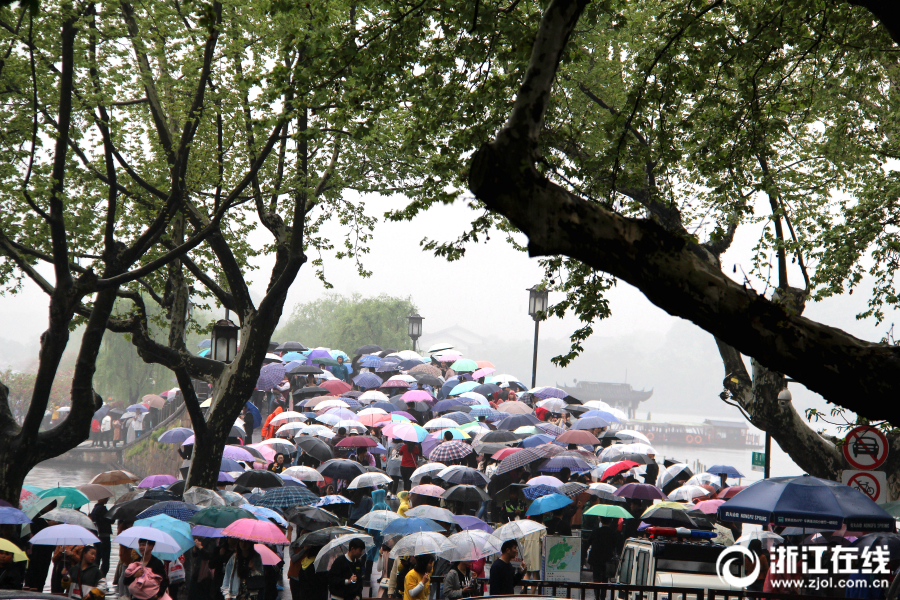 4月5日,清明小长假首日,杭州细雨绵绵,西湖景区游客络绎不绝。杭城虽降雨降温,但西湖景区前来赏花踏青的游客如潮,断桥似人桥。(浙江在线拍友 里尔 柱子 摄)