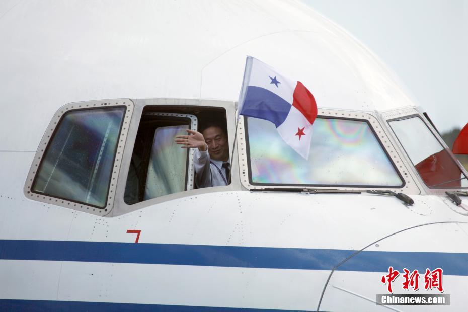 当地时间4月5日下午,作为中国与巴拿马之间首条直飞航线首航班机的国航CA885航班降落在巴拿马城托库门国际机场,标志着中巴两国间直航成功开通。中国与巴拿马于2017年6月正式建立大使级外交关系。图为首航班机进入泊机位后,飞行员向地勤人员招手致意。 中新社记者 余瑞冬 摄