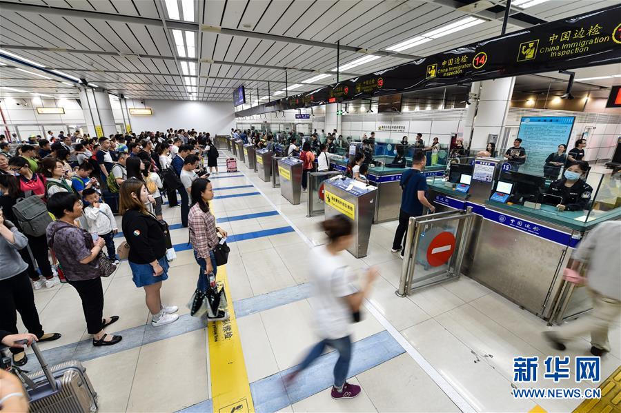 4月6日,在深圳湾口岸出境大厅,旅客在人工查验通道排队准备接受查验。清明节期间,返乡祭扫、出境旅游购物客流叠加,让深圳各口岸呈现“爆棚”状态。据统计,在4月4日当天,深圳边检共查验出入境旅客65万余人次。为确保通关便捷顺畅,深圳边检总站开启全部查验通道,并根据入出境高峰时段人员入出的数量、类别合理设置通道,采取分类引导、自助通道转人工查验等措施,最大限度提升通关效率,减少等候时间。新华社记者 毛思倩 摄