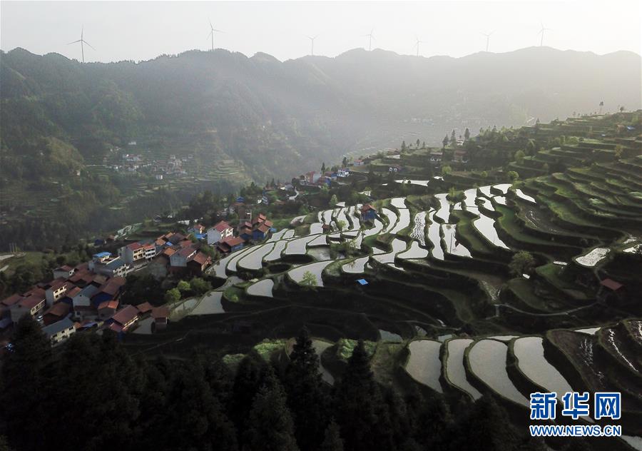 贵州省锦屏县固本乡东庄村春耕后的梯田景观(4月6日无人机拍摄)。清明时节,贵州省黔东南苗族侗族自治州锦屏县的农民忙着耕田、翻地、搬运农家肥,田间地头一片繁忙景象。 新华社发(杨文斌 摄)