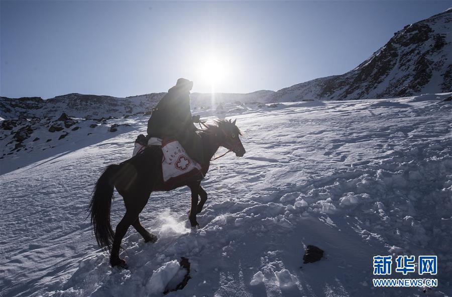 新疆天山深处包扎得尔牧区卫生院的巡诊医生叶力夏提在冬牧场巡诊途中纵马翻越乔拉克达坂(2017年12月15日摄)。新华社记者 江文耀 摄