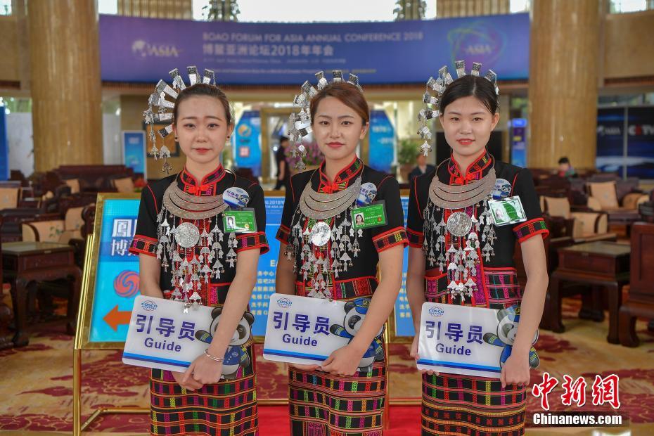 4月7日,身着海南黎族传统服饰的的工作人员在博鳌亚洲论坛大酒店门口迎接宾客。中新社记者 骆云飞 摄