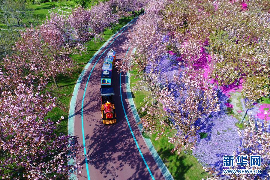 4月8日,观光小火车行驶在江苏南通洲际绿博园。日前,江苏南通洲际绿博园鲜花争艳,宛如为大地铺上别具风格的“地毯”。新华社发(许丛军 摄)