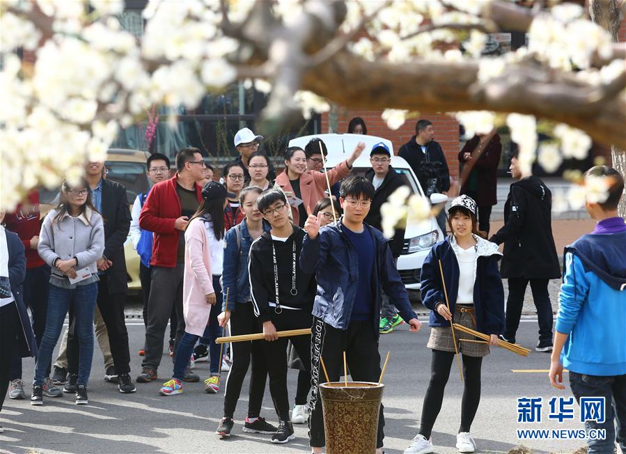 4月8日,学生在南开大学梨园春会上体验投壶游戏。 当日,“芳华梨园春咏南开”南开大学第二届梨园春会在该校津南校区梨树园举行。本届活动由梨园诗会、踏春游园两个环节组成,现场设置了诗朗诵、飞花令、戏曲、猜谜、投壶等传统文化体验项目,吸引众多师生及市民前来欣赏梨花美景、体验学府文化。新华社发(刘东岳 摄)