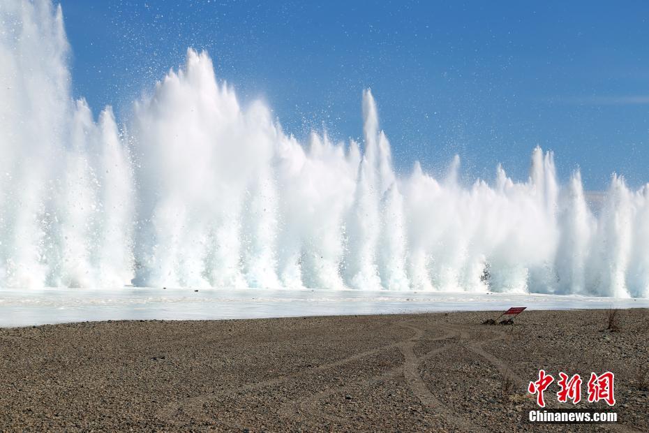 黑龙江漠河段防凌爆破激起百米冰瀑