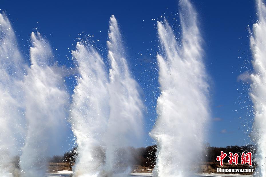 随着爆破组长对起爆点下达爆破命令,冰封江面瞬间激起一道道高达百米的冰柱,连结一片有如瀑布,形成转瞬即逝的壮观奇景。文/王景阳 王琳 图/王景阳